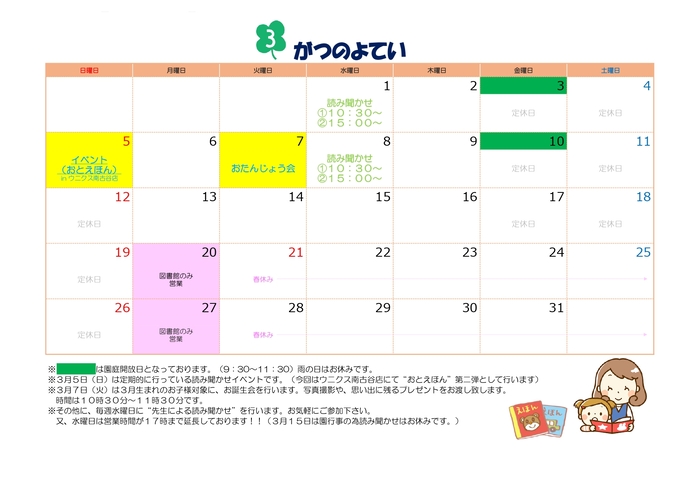 春期期間中(3月)は3月20日(月)、27日(月)のみ営業予定です。