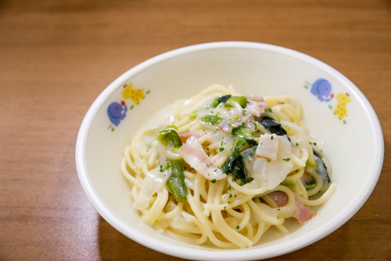 ⑥ 全体が混ざったら再度火を着け、醤油、塩で味を整え、パスタとほうれん草を入れて混ぜ合わせ、全体に火が通ったら出来上がり。