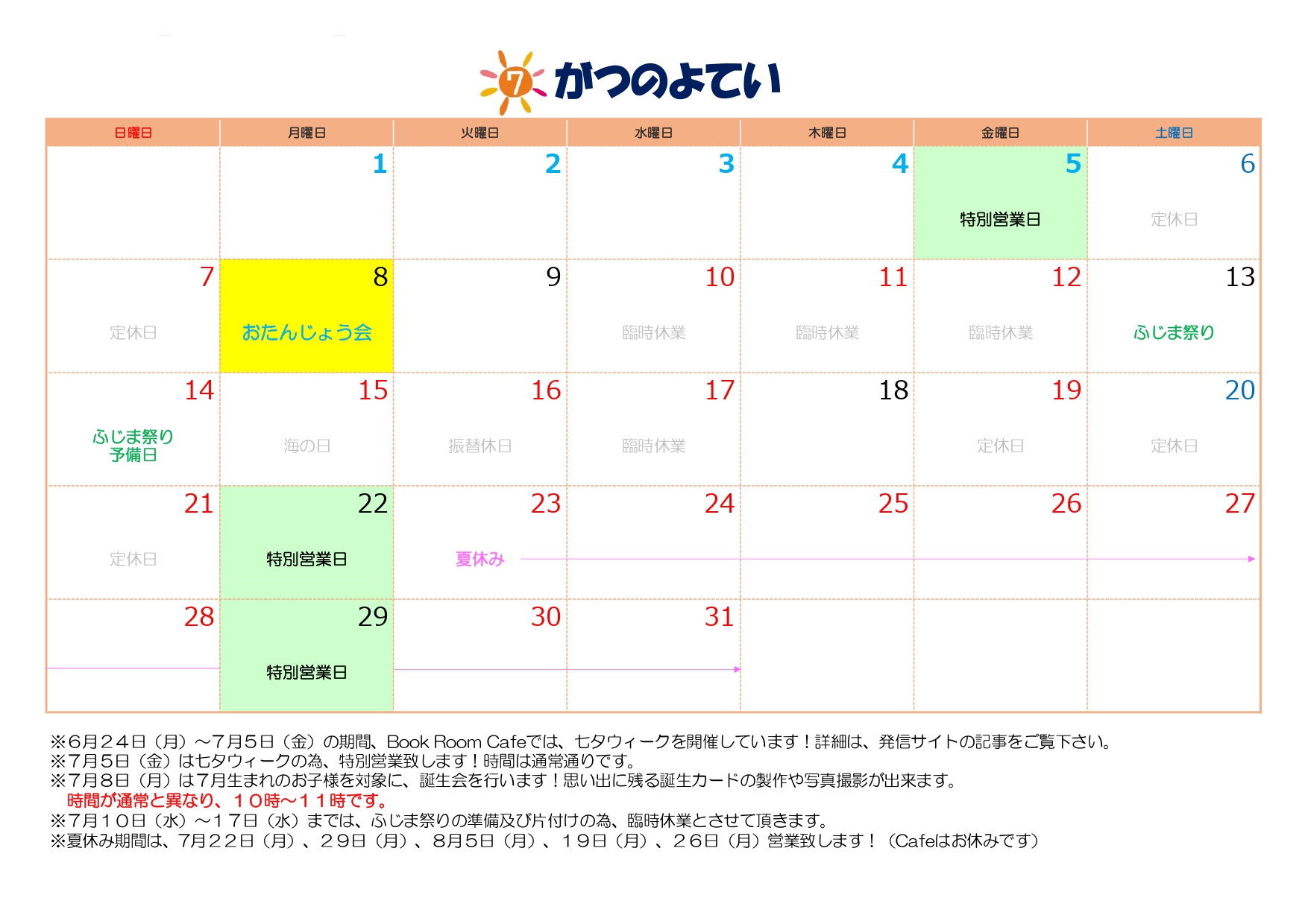 <営業日>7月22日(月)、29日(月)、8月5日(月)、19日(月)、26日(月)